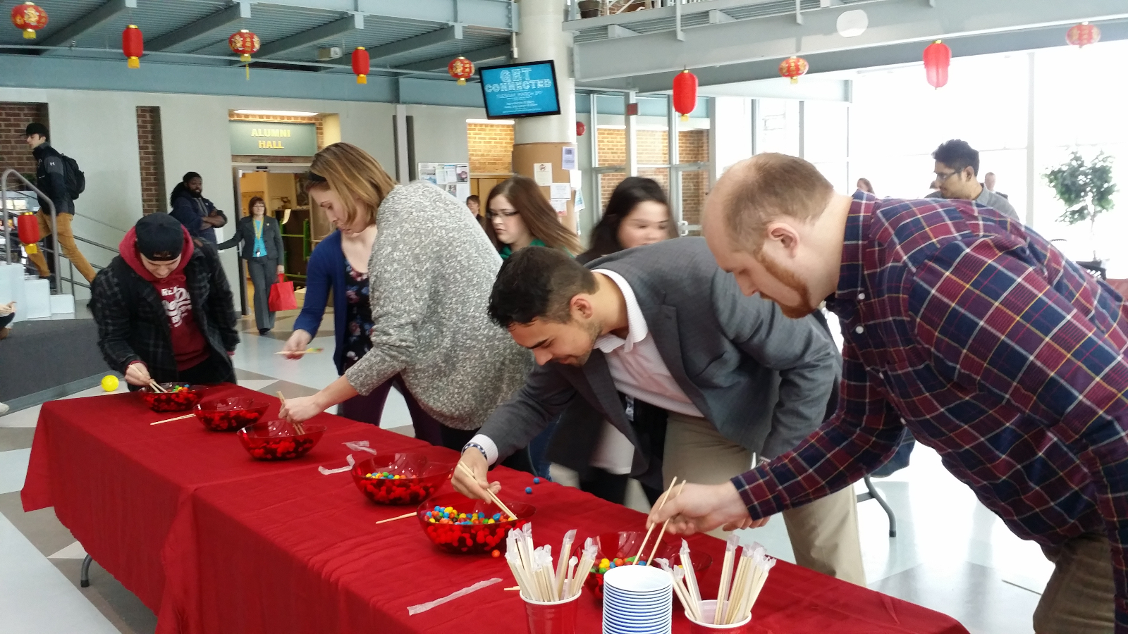 During the celebration, Chinese food was provided and attendees participated in Chinese games, like using chopsticks to pick up marbles.